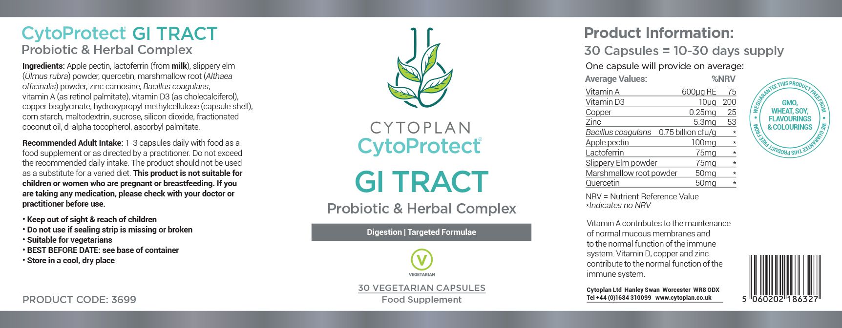 CytoProtect® GI Tract përmban zink, bakër, vitaminë A dhe vitaminë D, së bashku me Bacillus coagulans, laktoferrinë, lëvore të rrëshqitshme (slippery elm), pluhur rrënje alte (marshmallow root), pektinë molle dhe kuercetinë.