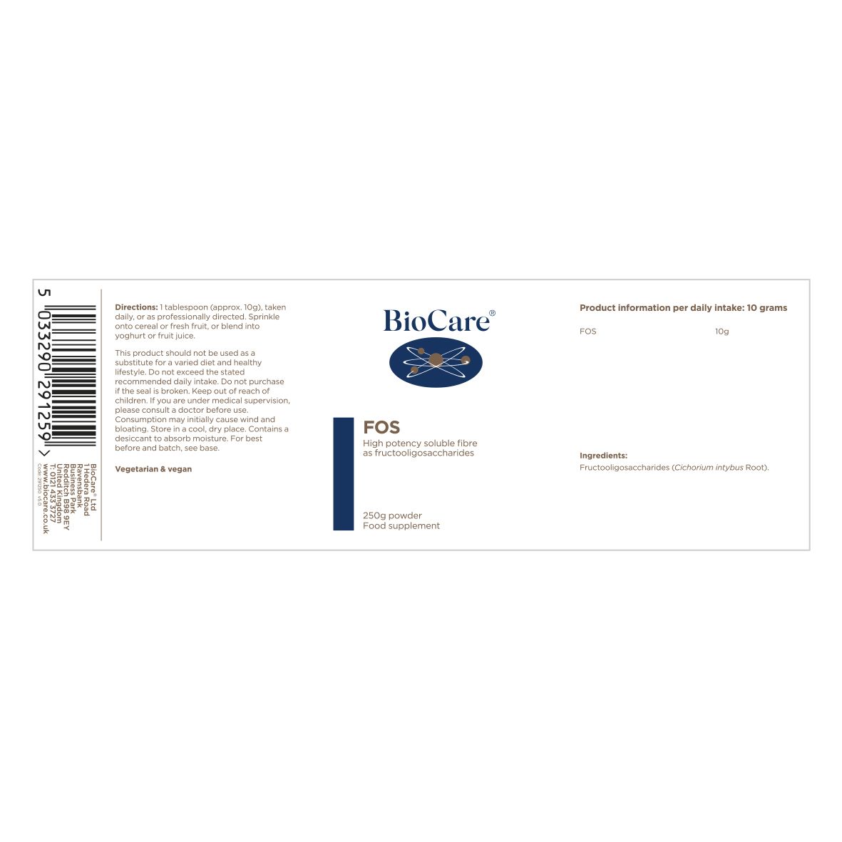 • Pluhuri BioCare® FOS është një burim natyral i fibrave prebiotike nga cikorja në një formë pluhuri që mund të përdoret si shtesë ose në gatim. FOS është natyrshëm i ëmbël por nuk ngre nivelet e sheqerit në gjak, duke e bërë atë një alternativë ideale për sheqerin ose ëmbëlsuesit.