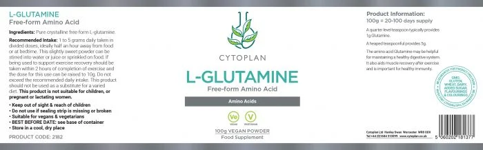 Formati jonë nga Cytoplan përmban L-glutaminë të pastër kristalore në formë të lirë. Glutamina është e rëndësishme për largimin e amoniakut të tepërt (një produkt i zakonshëm i toksinave në trup). Ai gjithashtu ndihmon në funksionimin e sistemit tuaj imunitar dhe mund të jetë i nevojshëm për funksionimin normal të trurit dhe tretjen.