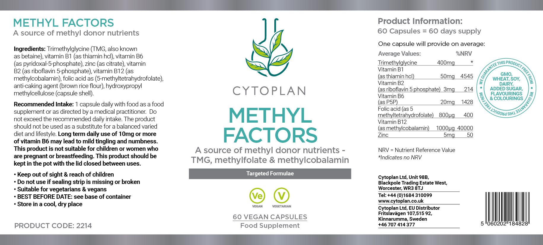 Trimetilglicinë (TMG, e njohur edhe si betainë), vitaminë B1 (si tiaminë HCl), vitaminë B6 (si piridoksal-5-fosfat), zink (si citrat), vitaminë B2 (si riboflavin-5-fosfat), vitaminë B12 (si metilkobalamin), acid folik (si 5-metiltetrahidrofolat), miell orizi kaf, celulozë bimore (mbështjellësi i kapsulës).